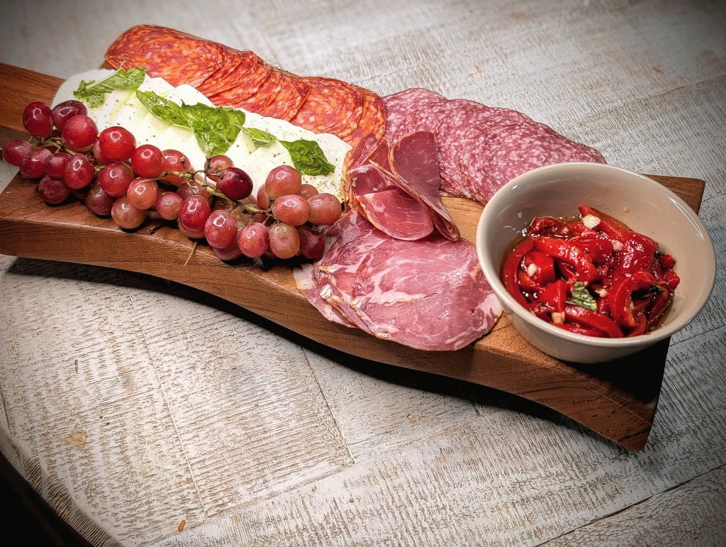 - Arrange the board: Keep ingredients grouped—peppers on one side, mozzarella in the center, meats on the right.
